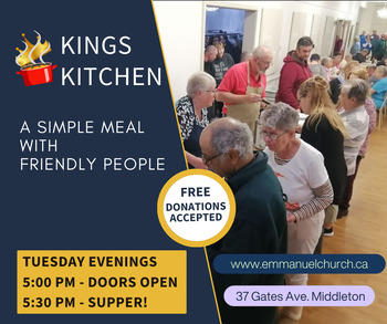 Kings Kitchen - a simple meal with friendly people. This free weekly hot-meal (during the colder months of the year) is open to anyone. Whether you're struggling with putting food on the table, or you find yourself in need of valuable community, you are welcome!
