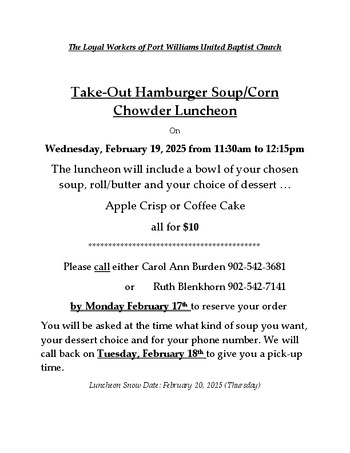 Please call as early as possible to Carol Ann at 902-542-3681 but orders must be in by Monday, February 17th. I will call you back the next day with a pick up time between 11:30 and 12:15.