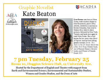 Kate Beaton was born in Nova Scotia, took a history degree in New Brunswick, paid it off in Alberta, worked in a museum in British Columbia, then went to Ontario to draw pictures, followed by New York, Toronto, and back once again to rural Nova Scotia. She is best known for her comic strip Hark! A Vagrant, and her best-selling graphic memoir Ducks: Two Years in the Oil Sands which was a New York Times Notable book, one of Barack Obama’s favorite books, and Winner of Canada Reads 2023.