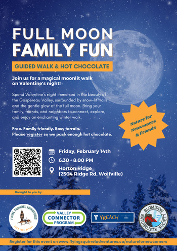 Join Flying Squirrel Adventures for a family friendly moonlit walk along the beautiful Gaspereau River on Valentine's nite. We'll serve up some hot chocolate to round out the evening.