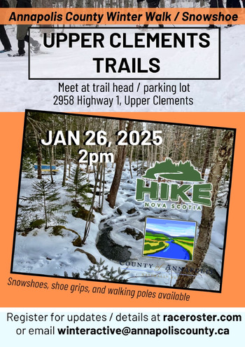 Join us for a free guided hike at Upper Clements Trails (UCT), with Annapolis County Recreation staff in partnership with Hike NS. Walking poles, shoe grips and snowshoes will be available for borrowing. Prize draws and refreshments after the hike!