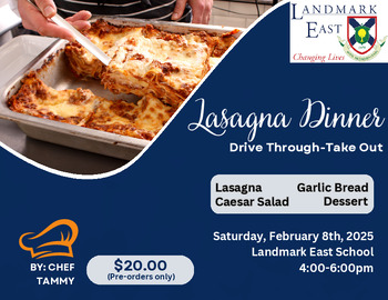 Landmark East School is hosting a Lasagna Drive thru take out dinner. Enjoy lasagna, caesar salad, garlic bread and dessert. Order on-line and come to the school 4-6pm and we'll bring your order right to your car!