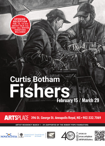 Curtis Botham graduated from NSCAD University in 2017. He has won numerous grants and awards, including scholarships from the Nova Scotia Talent Trust, the Canada Games Young Artist of Excellence Award, and numerous grants from Arts Nova Scotia and the Elizabeth Greenshields Foundation. His large-scale charcoal drawings have been displayed in galleries around Nova Scotia, and three of his works have been purchased by the Nova Scotia Art Bank. Since 2017, he has been interested in exploring the origins, impacts, and labour involved in the products that make up our material culture, and the social and environmental effects that industry and consumerism has on our lives. Since 2021, this focus on industry and labour has centered around the fishing industry in Nova Scotia.