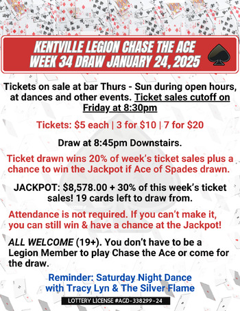Get your Chase the Ace tickets for a chance to win 20% of the week's sales plus a chance to win the Jackpot which has grown to $8,578.00 + 30% of week's sales!