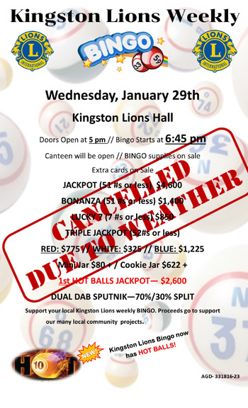Tonight's Bingo has been canceled due to current and forecast weather condictions, keeping in mind the safety of our volunteers and BINGO Players. Hope to see you next week.