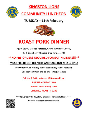No pre-orders required for eat in. Take out and delivered meals must be pre-ordered on Tuesday February 4th and Wednesday February 5th from 9 - 11 am by calling (902) 765-2128.
