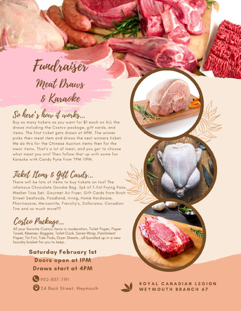 There will be lots of items to buy tickets on too! The infamous Chocolate Goodie Bag, 3pk of T-Fal Frying Pans, Washer Toss Set, Gourmet Air Fryer, Gift Cards from Birch Street Seafoods, Foodland, Irving, Home Hardware, Pharmasave, Mercantile, Frenchy’s, Dollarama, Canadian Tire and so much more!!!