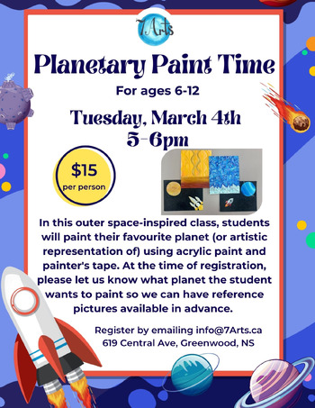 In this outer space-inspired class, students will paint their favourite planet (or artistic representation of) using acrylic paint and painter's tape. At the time of registration, please let us know which planet the student wants to paint so we can have reference photos available in advance. For ages 6-12.