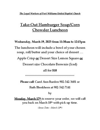 The Loyal Workers’ Corn Chowder/Hamburger Soup luncheon will include a bowl of your chosen soup, roll and butter and either Apple Crisp or Lemon Square or Brownie. Call by Monday, March 17th to Carol Ann Burden 902-542-3681 and I will call you back with a pick-up time on March 18th