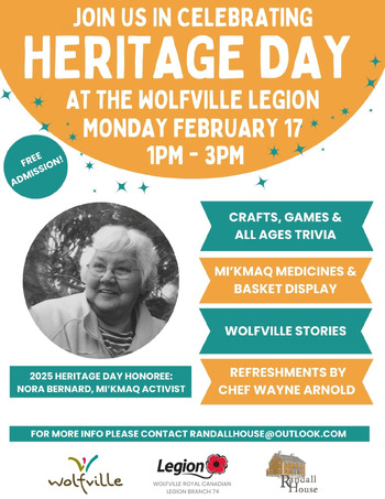 The Town of Wolfville and Randall House Museum are pleased to invite you to join us in celebrating Heritage Day at the Wolfville Legion.