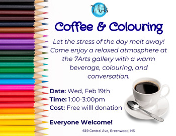 Let the stress of the day melt away! Come enjoy a relaxed atmosphere at the 7Arts gallery with a warm beverage, colouring, and conversation. All ages welcome!