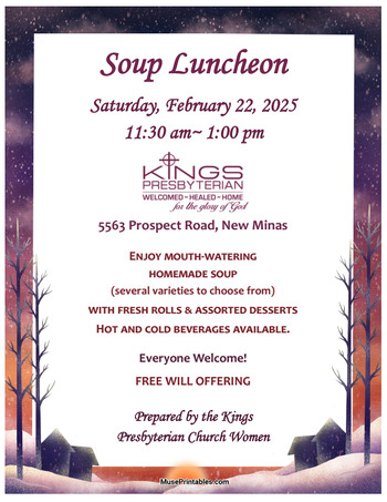 Come enjoy a variety of homemade soups and assorted desserts. Everyone welcome. Free Will Offering.