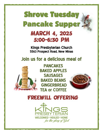 Join us for pancakes, baked apples, sausages, baked beans, gingerbread, tea and coffee. Free Will offering.