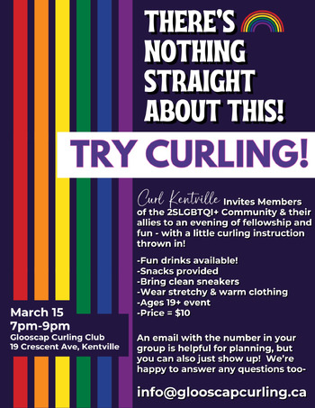Curl Kentville Invites Members of the 2SLGBTQI+ Community & their allies to an evening of fellowship and fun - with a little curling instruction thrown in!