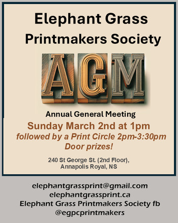 Elephant Grass Printmakers Society is a non-profit society committed to supporting the practice of handmade printmaking in NS by providing facilities, education and a community space for all who are interested regardless of expertise.