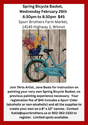Join 7Arts Artist Jane Beals for instruction on painting your very own Spring Bicycle Basket. No previous painting experience necessary. You are welcome to paint your background, bicycle and flowers colours of your choosing. Your registration fee includes instruction and all supplies to paint your own 8" x 10" canvas as well as a choice of Spurr Cider (alcoholic or non-alcoholic). Please contact Katie at Spurr Brothers Farm Market 902-363-2333 or [email protected] to confirm availability.