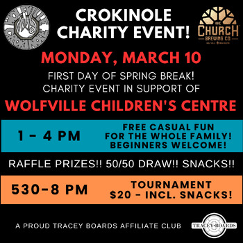 Wolfville Crokinole is hosting a full day charity event in conjunction with Church Brewing Co. in support of Wolfville Children's Centre!