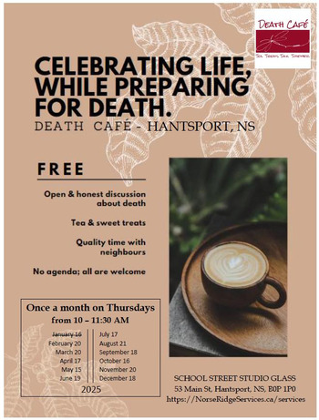 Celebrating life while preparing for death. All are welcome to join in an open & honest discussion about death. Or just come to listen. Coffee, tea & sweet treats provided.