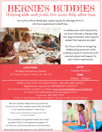 We are hosting a March Break kids' grief support event in Windsor, NS, in collaboration with SchoolsPlus.