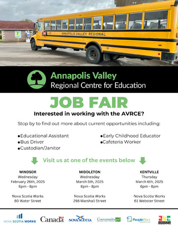 This exclusive event is your opportunity to connect with the Annapolis Valley Regional Centre for Education and explore rewarding career opportunities within the school board. Whether you’re a seasoned educator or just starting your journey in education, this is your chance to meet with AVRCE representatives, learn about available positions, and discover how you can make a difference in students' lives. Bring your resume and enthusiasm. Your future in education starts here!