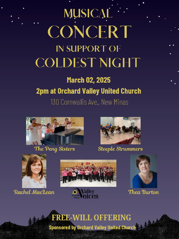 Featuring music from the Peng sisters, the Steeple Strummers, Rachel MacLean, Valley Voices and Thea Burton. Free will donation: all proceeds to Open Arms via Coldest Night of the Year.