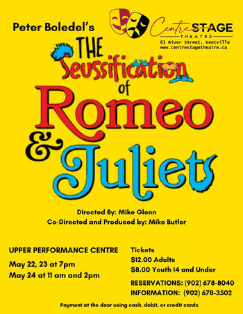 The Seussification of Romeo and Juliet, by Peter Boledel and directed by Mike Glenn, is a whimsical reinvention of Shakespeare's tragic love story Romeo and Juliet, complete with rhyming couplets, creative wordplay, and fantastical machines. It's a script Dr. Seuss might have come up with if he'd ever had his way with the story. Join an enthusiastic cast of characters as they rhyme their way through the greatest love story of all--Dr. Suess style