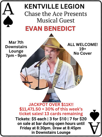 Another special treat this week with Kentville Legion's Chase the Ace entertainment! This week we're pleased to have returning as our guest Evan Benedict!! Evan plays a little bit of country, a little bit of rock.