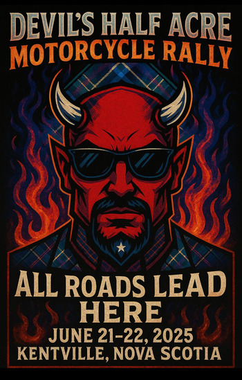 The Devil's Half Acre Motorcycle Rally is a family-friendly event in Kentville, Nova Scotia that takes place in the spring. The rally features bike shows, live music, and a mural walk.