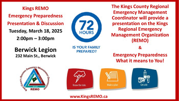 Dan Stovel, the Regional Emergency Management Coordinator for Kings County, in partnership with the Berwick Legion, will be conducting a REMO presentation on Emergency Preparedness. This seminar is to educate you on preparing for an emergency. You do not need to be a Legion member to attend. All are welcome.