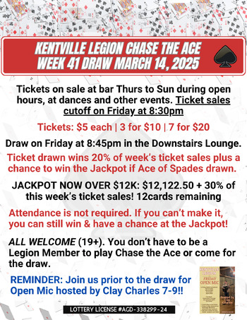 Get your Chase the Ace tickets for a chance to win 20% of the week's sales plus a chance to win the Jackpot which has grown to $12,122.50 + 30% of week's sales!