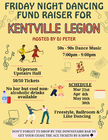 DJ Peter will spin great dancing tunes from the 50s to the 90s to get your feet moving! So lace up your dancing shoes and come on out for a fun night of dancing and socializing while supporting the Kentville Legion. ALL WELCOME!