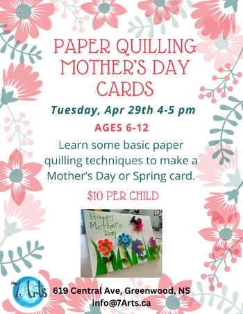 Join us to learn some basic paper quilling techniques with artist Christine. We will be making Mother's Day (or Spring) cards. This workshop is for ages 6-12. Register by email.