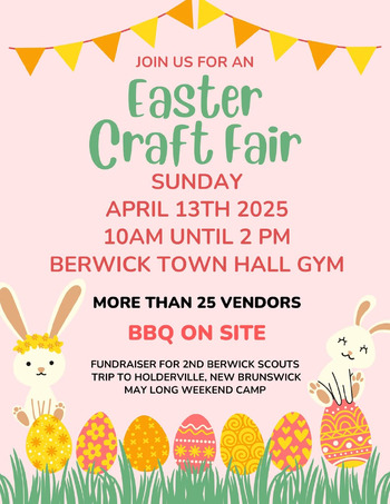 2nd Berwick Scouts are hosting a Spring Craft Fair and BBQ. Over 30 vendors. Proceeds go to the 2025 Camporee Trip to New Brunswick.