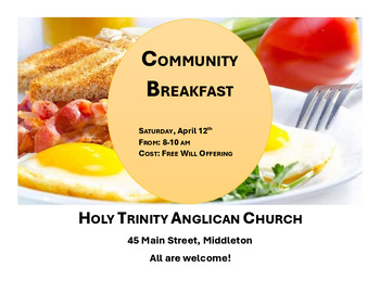 Holy Trinity Anglican Church in Middleton will once again be seeing a community breakfast. We only serve fresh ingredients and local. Our range fed eggs are said to be “”The best eggs east of TOFINO”….Anon. and we take great pride in serving 100% Pure N.S. Maple Syrup with your buttermilk pancakes.