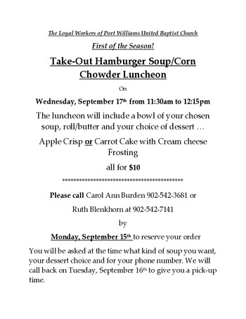Take Out Luncheon. Hamburger Soup / Corn Chowder, Flower Cart roll and butter, Apple Crisp or Carrot Cake with Cream Cheese Icing. Call Carol Ann Burden, 902-542-3681 by Monday, Sept. 15th, expect a call back on Tuesday Sept. 16th with a pick-up time for Wednesday.