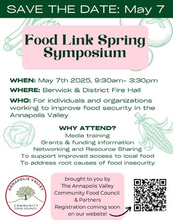 The Annapolis Valley Community Food Council is excited to host its first Food Link Spring Symposium - a Gathering to better connect and equip individuals and organizations working to improve food security in the Valley.