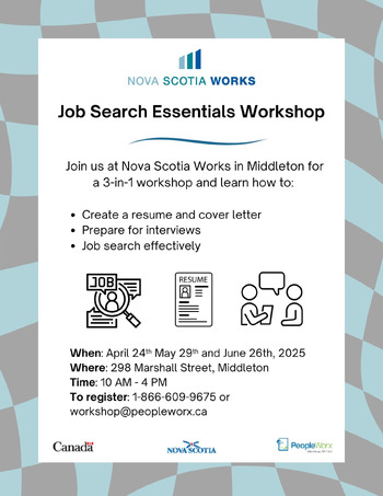 Join us at Nova Scotia Works in Middleton for a comprehensive workshop that covers key aspects of the job search process! Learn how to create a standout resume and cover letter, prepare for job interviews, and explore Nova Scotia Works Online to enhance your job search skills. This workshop will equip you with the tools and knowledge you need to confidently navigate the job market and take the next step in your career. Don't miss out on this valuable opportunity!