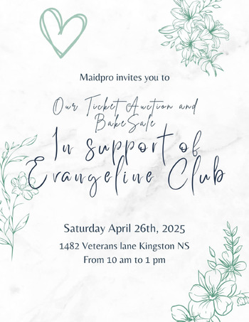 Maidpro of Annapolis valley will be holding a ticket auction in support of the Evangeline club. There will also be a bake sale and a ticket raffle for a handmade quilt.
