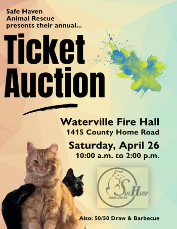 Fundraiser for Safe Haven Animal Rescue. All new items. Attendees buy tickets and bid on items—as many tickets per item as they like. $5.00 for 50 tickets, $10 for 100 tickets, $20 for 225 tickets. Also—a 50-50 draw, barbeque, and raffle on a cat-themed quilt. All funds raised are going to support Safe Haven cats! Everyone welcome!