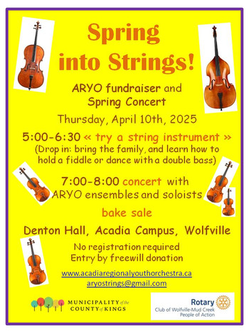 Come try a string instrument and discover our string program for young people! Drop in between 5:00 and 6:30 to try a violin, viola, cello or double bass, and enjoy something from our bake-sale table. Our spring concert starts at 7:00 PM and will run for one hour. Entry by freewill donation at the door.