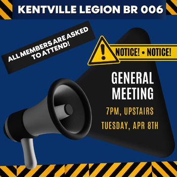 KENTVILLE LEGION MEMBERS! We need you to attend the General Meeting to form a quorum so the meeting can be held. Your Kentville Legion needs you there to vote on important issues, have your questions answered, make suggestions, bring forth any concerns, etc. Have your say!