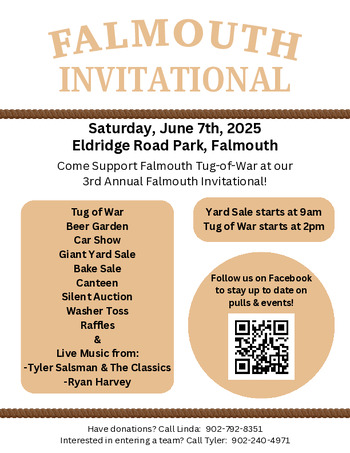 Falmouth Tug O War invites you to our third annual Falmouth Invitational Pulls. Tug of War pulls, Washer Toss, Yard Sale, Silent Auction, Live Music, Raffles, Beer Garden and Canteen on site!
