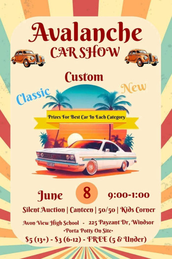 For anyone who is interested in Classic, Custom or New cars, the Avalanche Football Team is hosting their annual Car Show with a silent auction, 50/50, BBQ, kids corner and live music performed by Ryan Harvey.