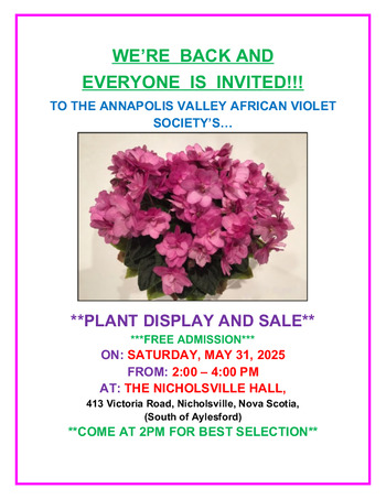 The Annapolis Valley African Violet Society are holding a plant display and sale of African violets and other gesneriads. Come early for the best selection.