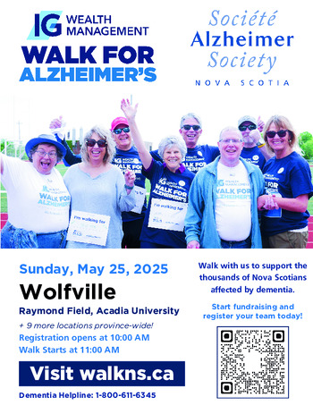 5k Harvest Moon Trail, Wolfville. Walk as much or as little as you like! IG Wealth Management Walk for Alzheimer's fundraising event, free T-Shirt for everyone that registers. You can walk the outdoor track (accessible) or along the trail. Well behaved dogs are welcome. Registration begins at 10am