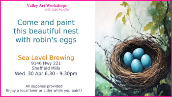 This is such a beautiful and classic painting subject! Come along to the cozy taproom of Sea Level Brewing and celebrate spring with this lovely painting of a nest with robin's blue eggs. Enjoy locally produced beers, ciders and cocktails while you paint!