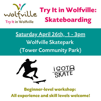 The Town of Wolfville is collaborating with Kentville skate shop IGot Skate to provide this session free of charge for residents of all ages, genders, and abilities who would like to "Try It in Wolfville." Furthermore, IGot Skate will be supplying boards, helmets, and all other safety gear, in addition to a basic instructional lesson.