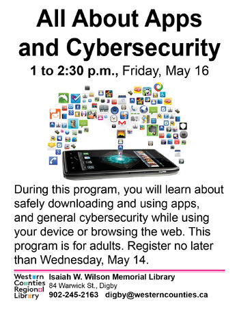 Are you worried about how secure your information is online? During this program, you will learn about safely downloading and using apps, and general cybersecurity while using your device or browsing the web. This program is for adults. Register no later than Wednesday, May 14 by contacting the library.