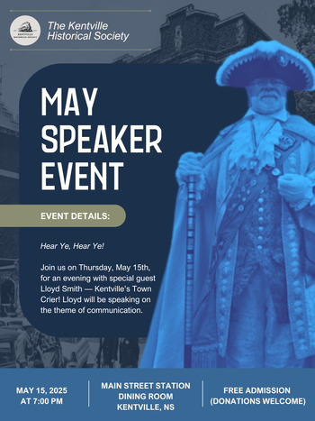 Kentville Historical Society's Guest Speaker, Lloyd Smith (longest serving Town Crier in North America, who represents towns and villages in NS) will give a historical talk on the Crier's role over the ages. All are welcome. Donations appreciated.
