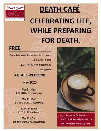 Celebrating life while preparing for death. All are welcome to join in an open & honest discussion about death. Or just come to listen. Coffee, tea & sweet treats provided.